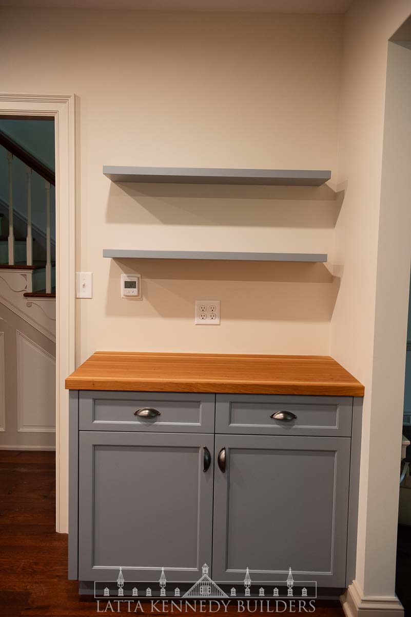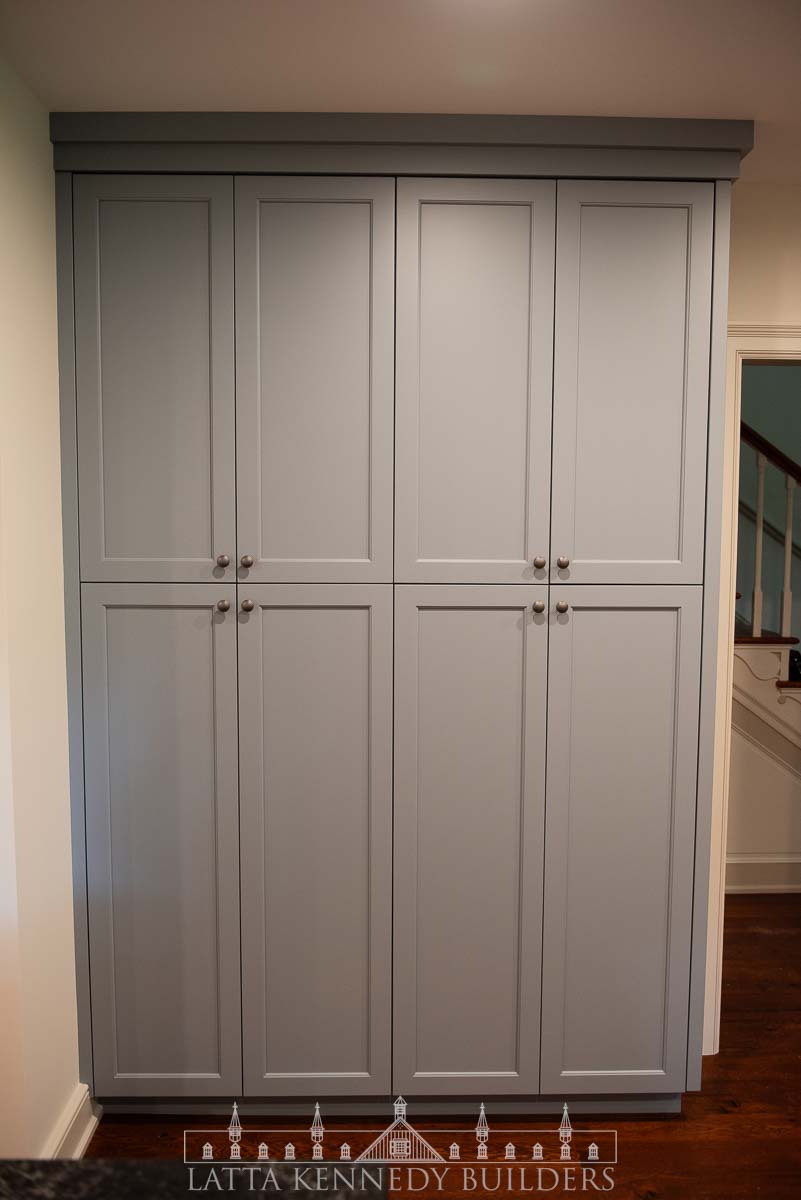 The centerpiece of this kitchen is the custom cabinetry, designed and built by Latta Kennedy Millworks. Every detail was thoughtfully crafted to maximize storage and convenience while maintaining a refined look. Features include a dedicated coffee bar, custom spice pullouts, tray dividers, rollout trays for pots and pans, flour and sugar drawers, and a large floor-to-ceiling pantry closet providing exceptional organization for everyday living.