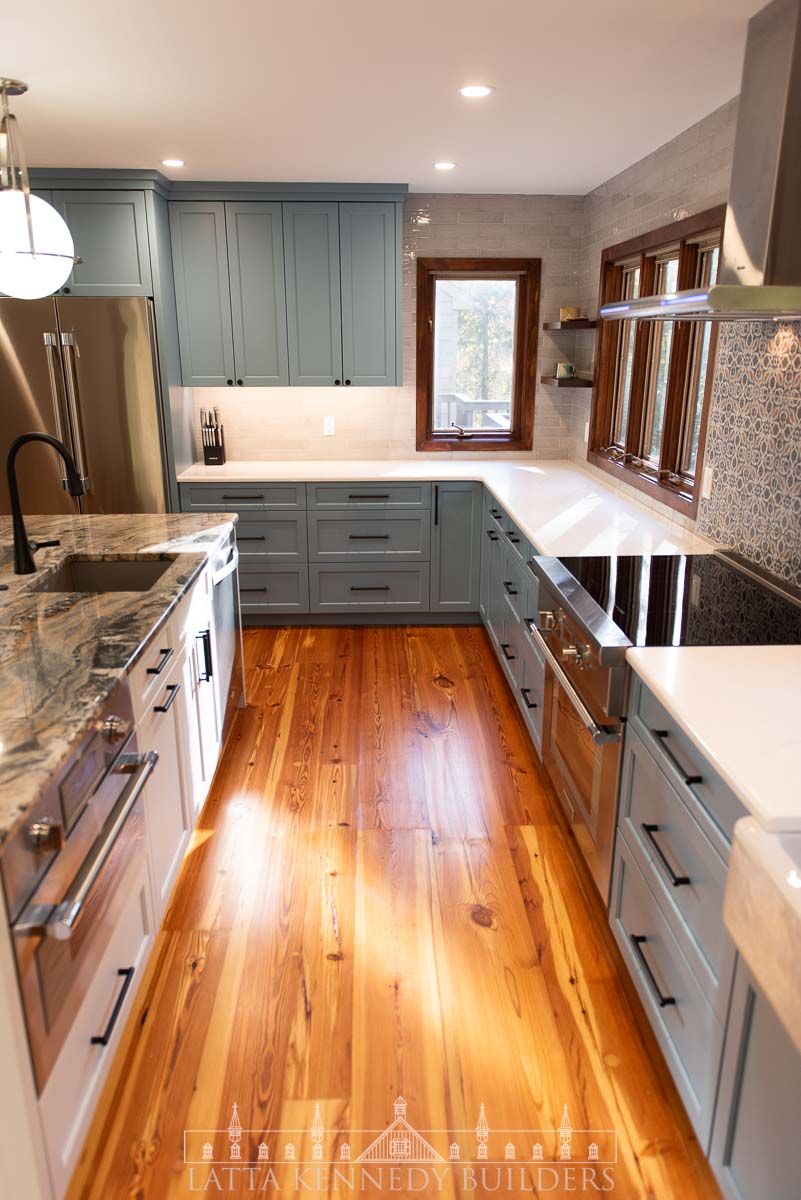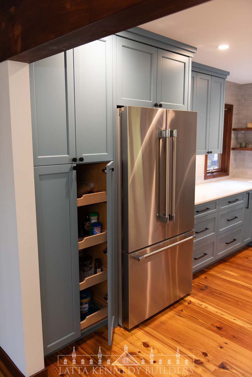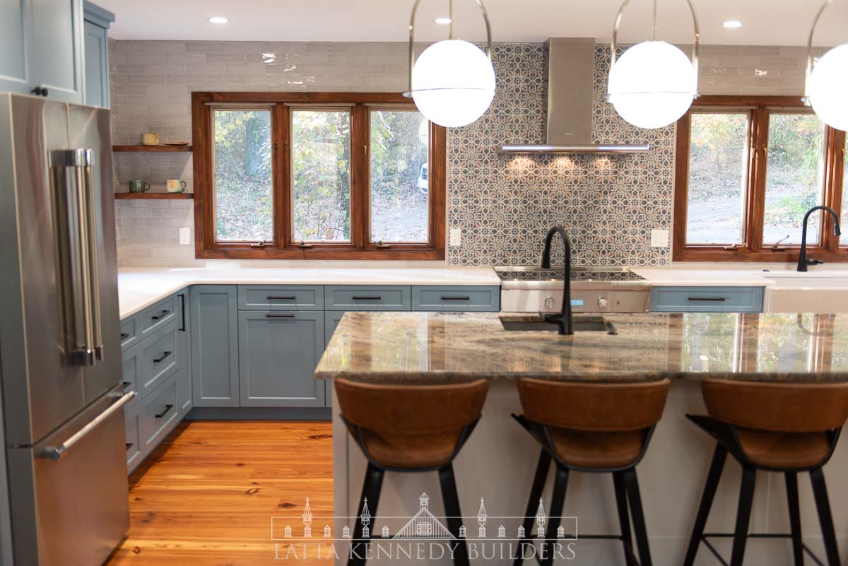This kitchen remodel in Elverson, PA is a stunning showcase of refined design and elevated functionality. At its center, a spacious island offers the perfect spot for entertaining guests or enjoying casual family meals. Surrounding the island, custom cabinetry by Latta Kennedy Millworks offers exceptional storage and organization, blending craftsmanship with timeless beauty in a soft, sophisticated blue finish.