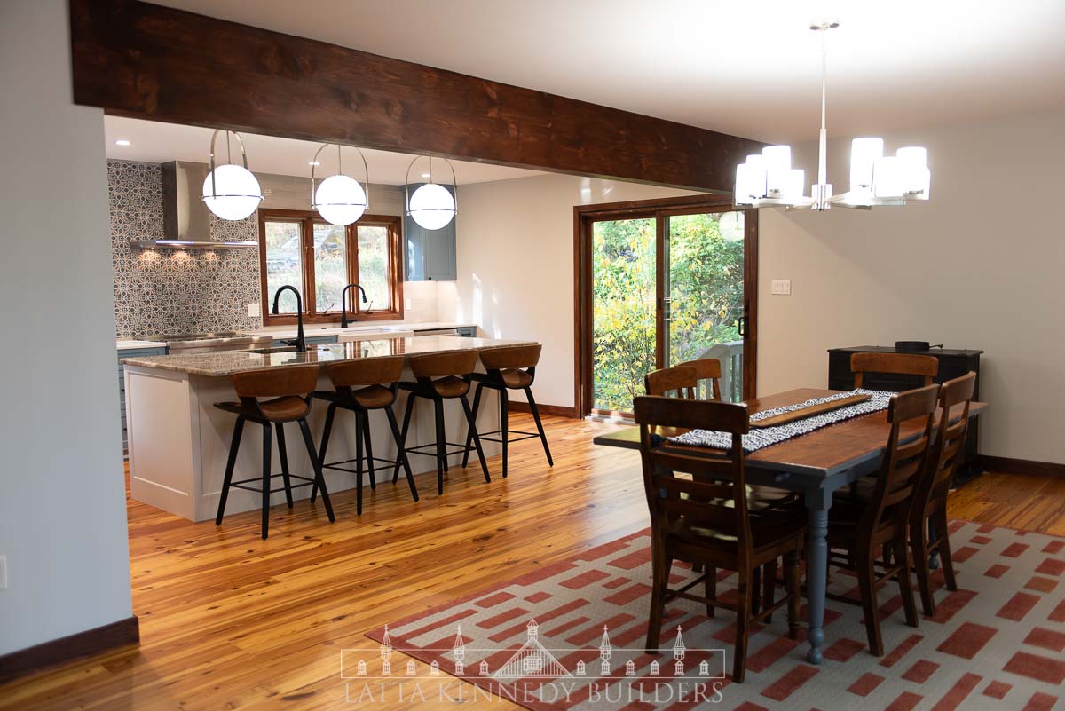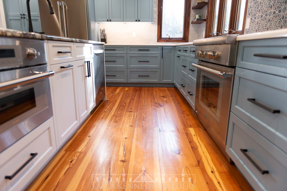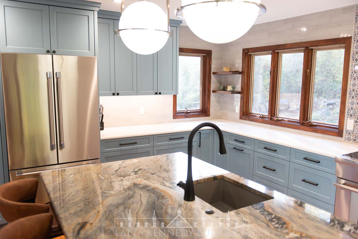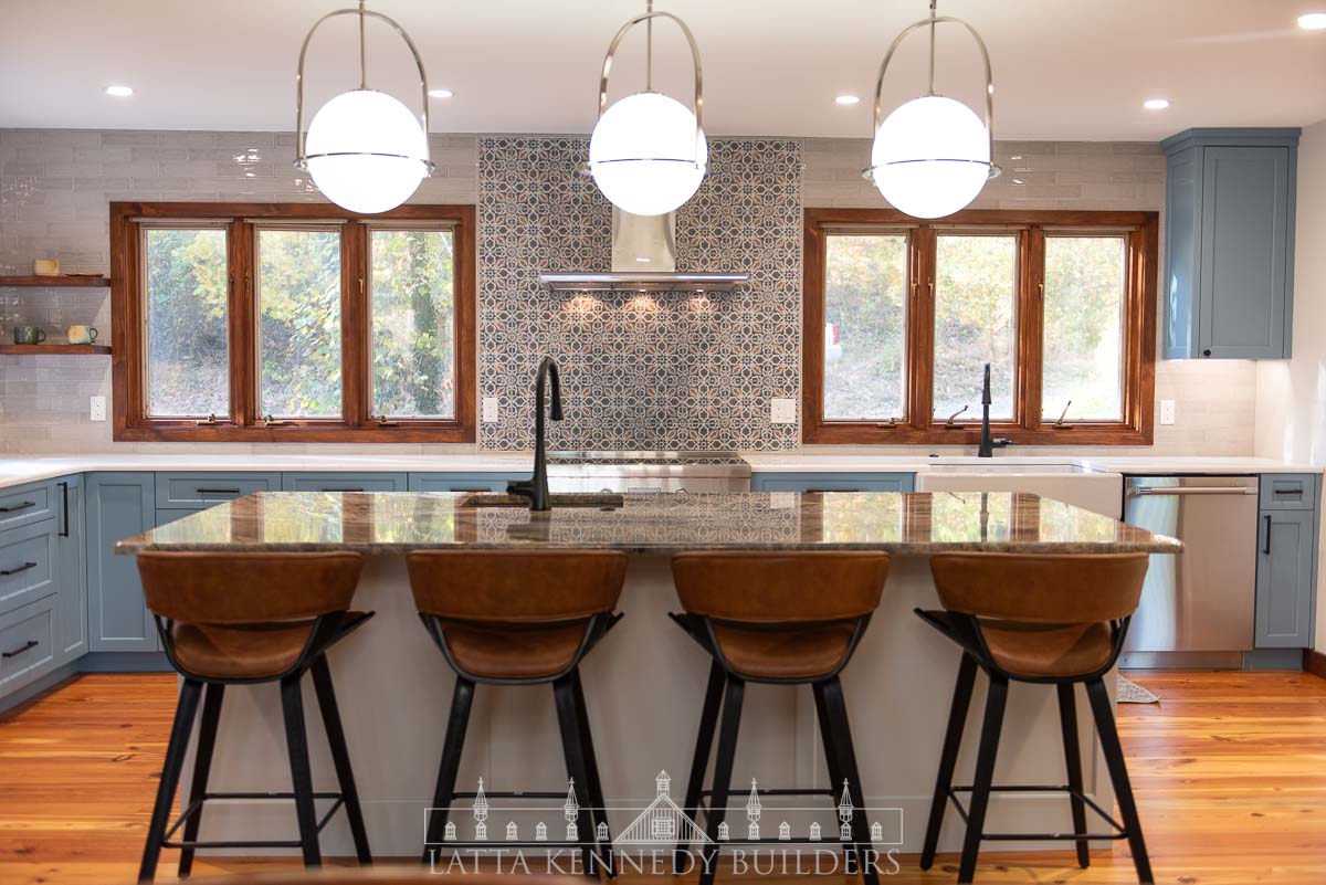 This kitchen remodel in Elverson, PA is a stunning showcase of refined design and elevated functionality. At its center, a spacious island offers the perfect spot for entertaining guests or enjoying casual family meals. Surrounding the island, custom cabinetry by Latta Kennedy Millworks offers exceptional storage and organization, blending craftsmanship with timeless beauty in a soft, sophisticated blue finish.