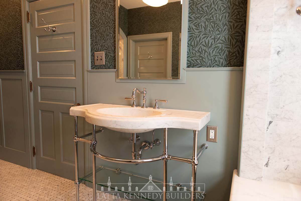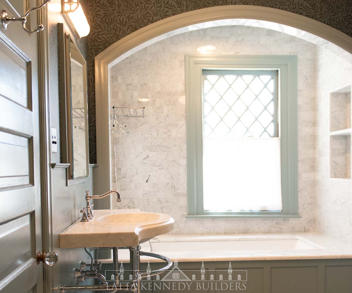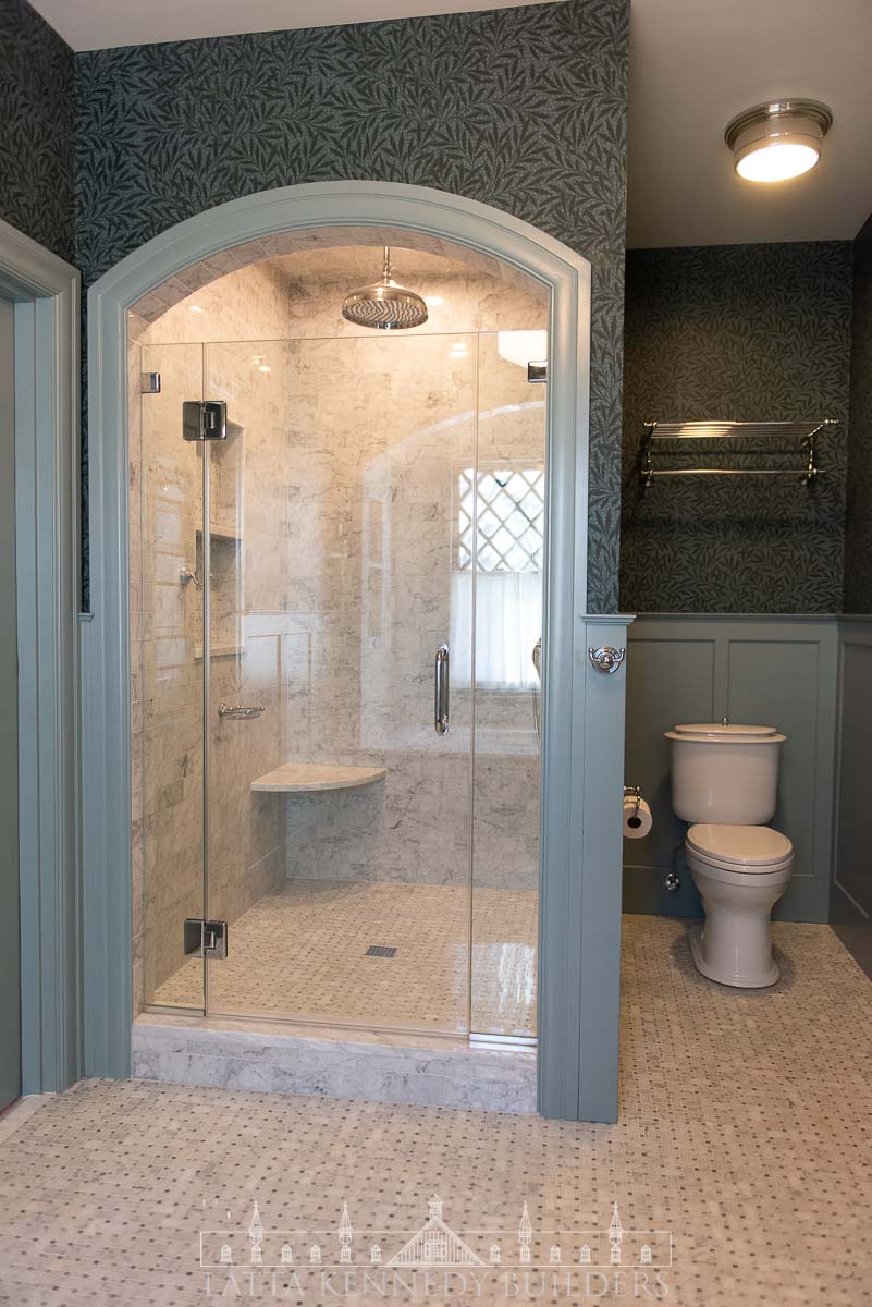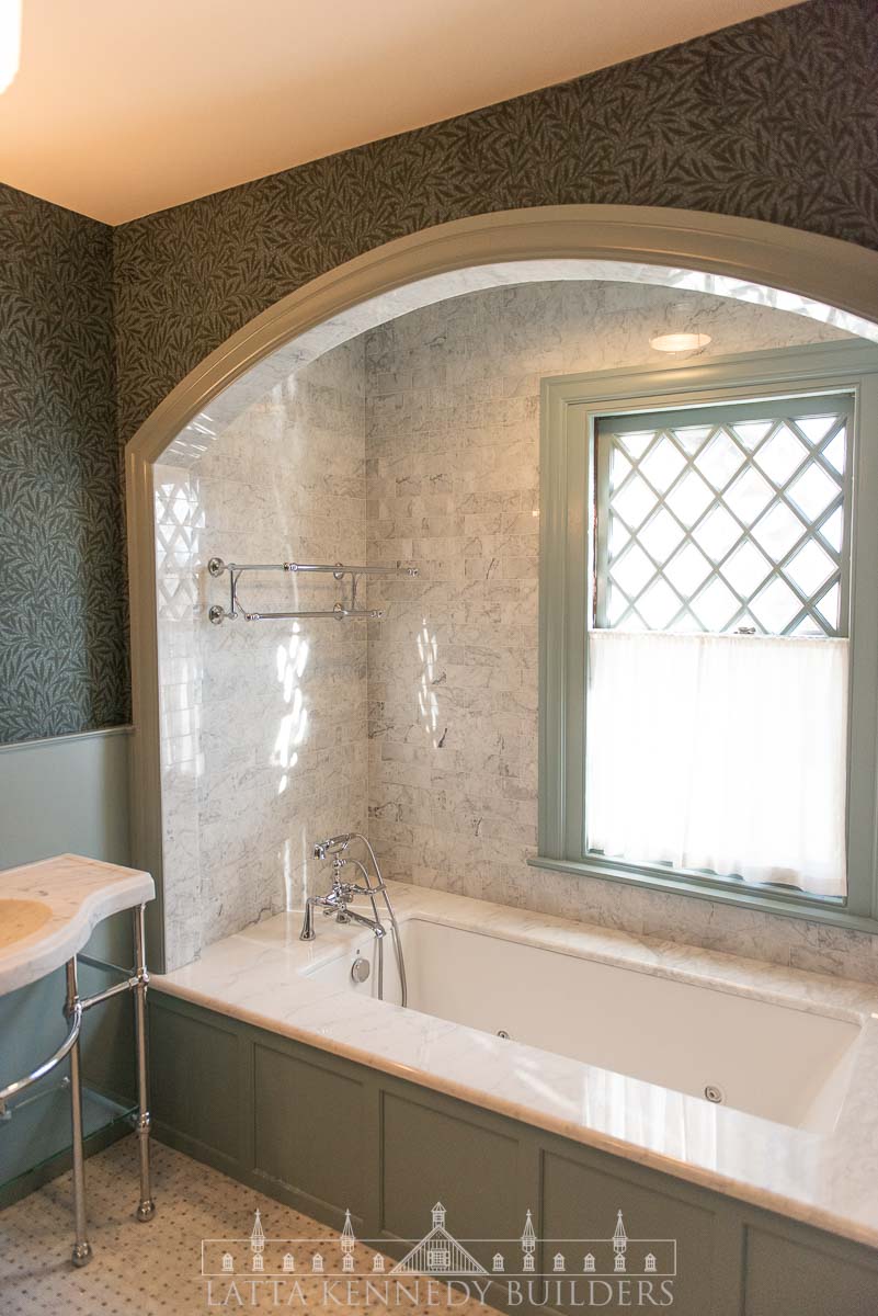 Our team partnered with Warren Claytor Architects to remodel this primary bathroom encompassing nothing short of classic beauty and modern functionality. New elegant arched entries for the shower and tub, paired with wallpaper (“Emery’s Willow”), in soothing blue and green hues, add depth and character to the space, creating a refined finish in every corner. A spacious marble-tiled shower with a large rain head and various luxurious fixtures by SIGMA offer a spa-like experience for everyday indulgence, while the generous soaking tub provides the perfect retreat for well-deserved moments of relaxation. Radiant heated flooring throughout provides a modern upgrade for every day comfort, while the new console vanity by Stone Forest with a stunning Carrara Marble top completes the timeless feel on this Wayne, PA bathroom remodel.