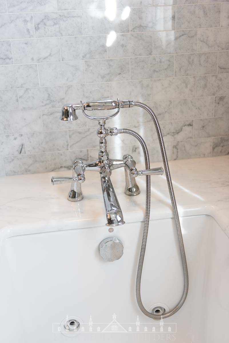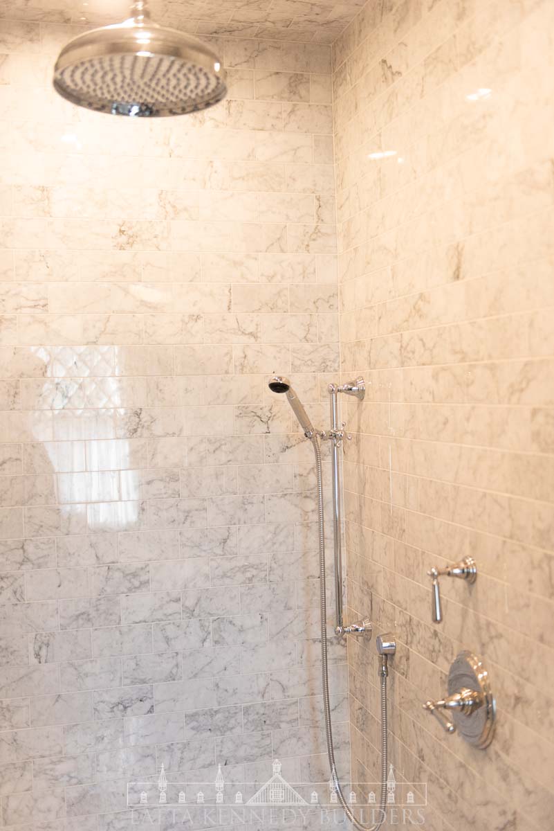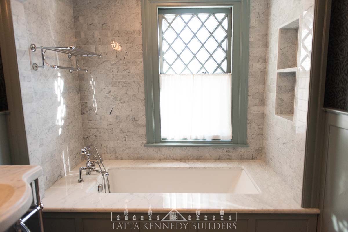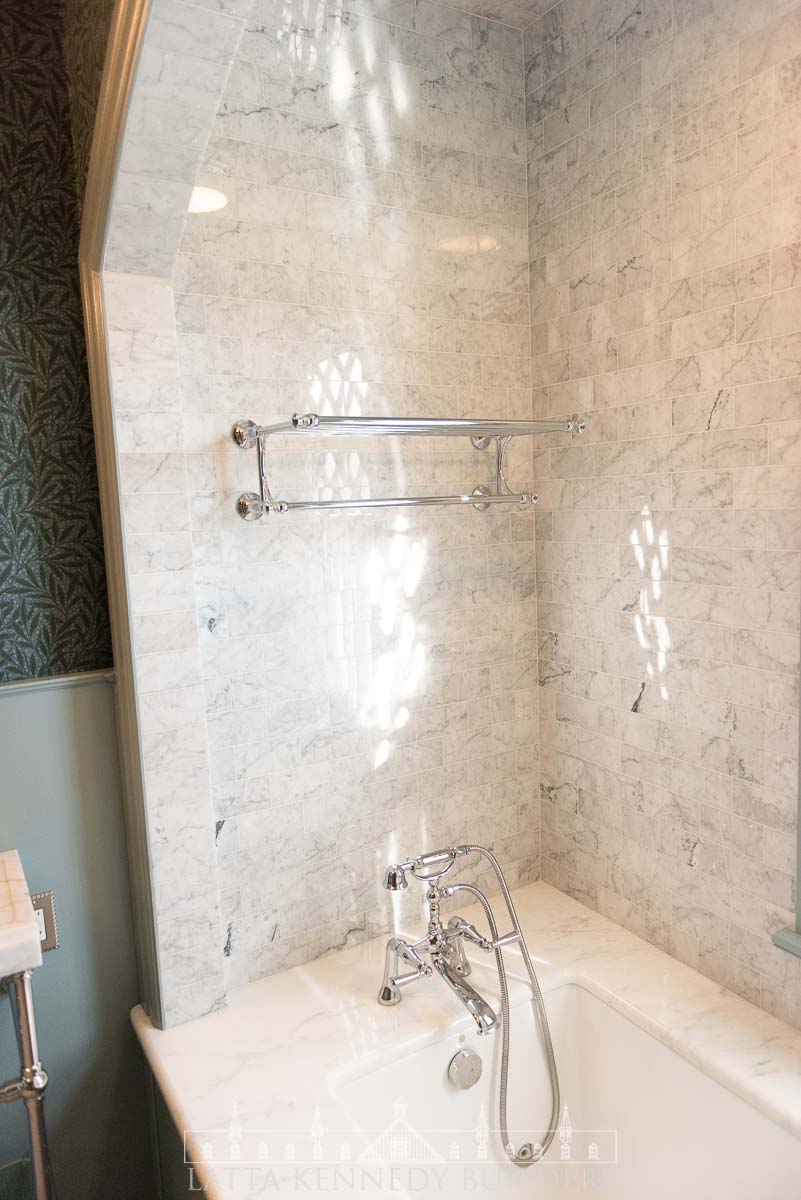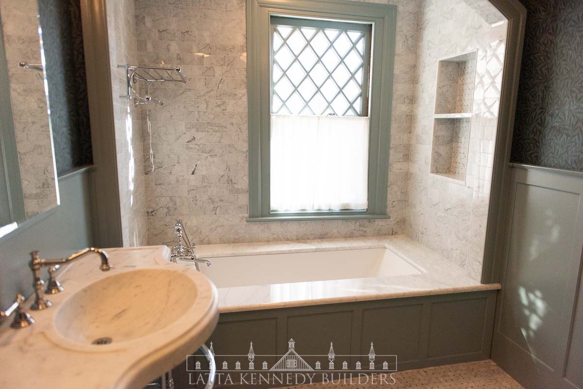 Our team partnered with Warren Claytor Architects to remodel this primary bathroom encompassing nothing short of classic beauty and modern functionality. New elegant arched entries for the shower and tub, paired with wallpaper (“Emery’s Willow”), in soothing blue and green hues, add depth and character to the space, creating a refined finish in every corner. A spacious marble-tiled shower with a large rain head and various luxurious fixtures by SIGMA offer a spa-like experience for everyday indulgence, while the generous soaking tub provides the perfect retreat for well-deserved moments of relaxation. Radiant heated flooring throughout provides a modern upgrade for every day comfort, while the new console vanity by Stone Forest with a stunning Carrara Marble top completes the timeless feel on this Wayne, PA bathroom remodel.
