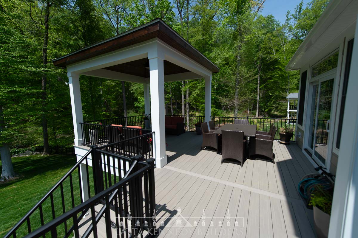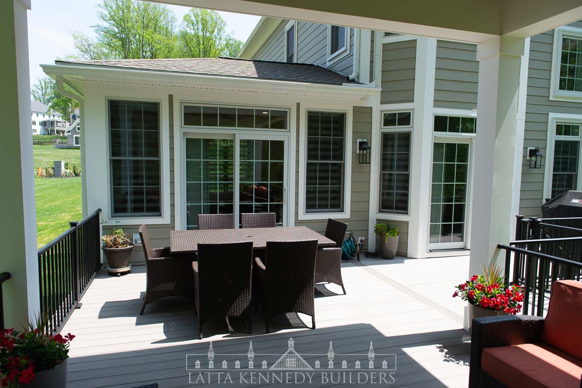 This beautiful renovation features a custom sunroom and basement addition that seamlessly connects to a spacious outdoor living area. The design includes a covered deck and lounge space, creating the perfect retreat for relaxation and entertaining. The exterior is finished with James Hardie Cedermill lap siding for long-lasting durability and classic style, complemented by GAF Timberline HD Architectural shingles for superior roof protection. The deck is built with TimberTech composite decking for low-maintenance elegance and enhanced longevity, while lighted Westbury metal railings provide both safety and a sophisticated touch. Overhead, a Northeastern white pine beadboard ceiling adds warmth and character to the covered lounge area, making it an inviting space for gatherings. This project showcases expert craftsmanship and thoughtful design, blending indoor comfort with outdoor beauty to elevate the homeowner’s lifestyle.