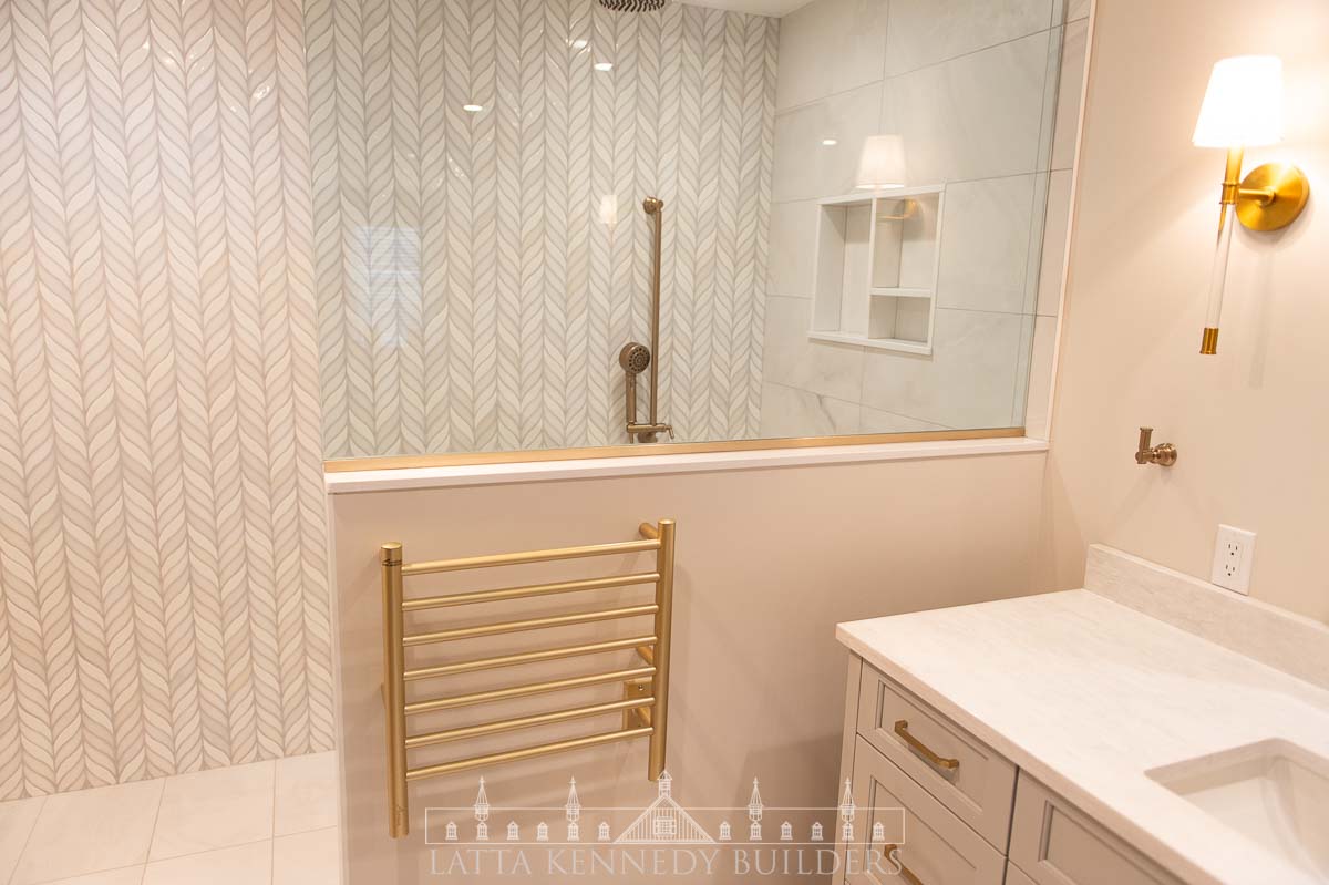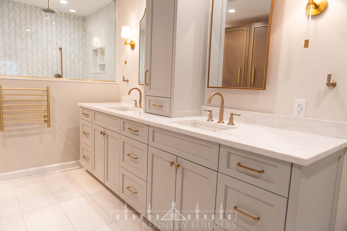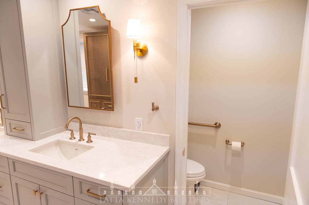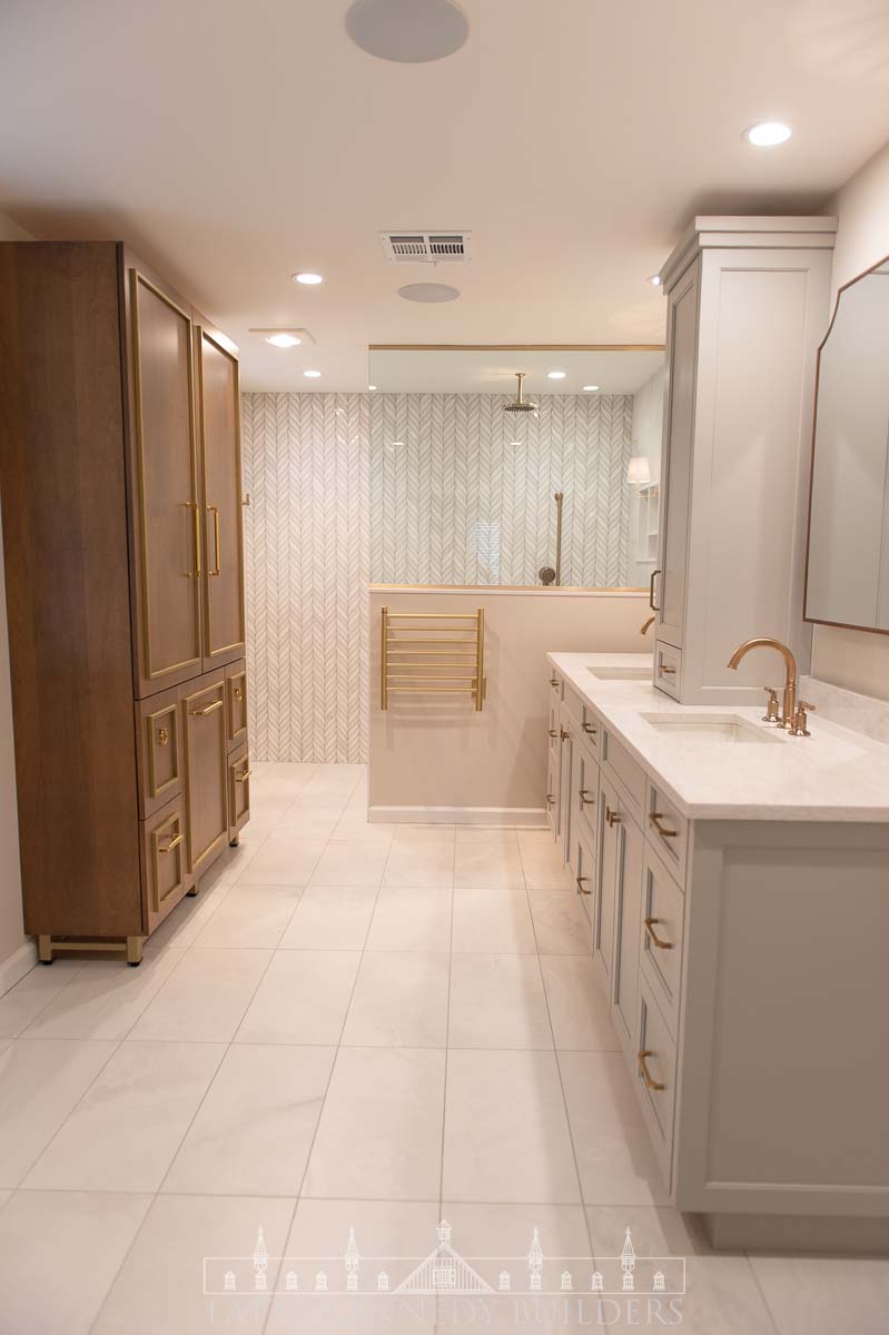 A newly framed water closet provides privacy, while soft, layered lighting enhances the calming atmosphere throughout the space. Custom cabinetry by Latta Kennedy Millworks introduces exceptional storage solutions, including an ingeniously designed laundry tilt-out for convenience. Luxe gold fixtures by Brizo elevate the design, complemented by recessed medicine cabinets and towel warmers for added functionality and indulgence. Every element from the elegant finishes to the thoughtful layout was crafted to create a bathroom that feels timeless and sophisticated.