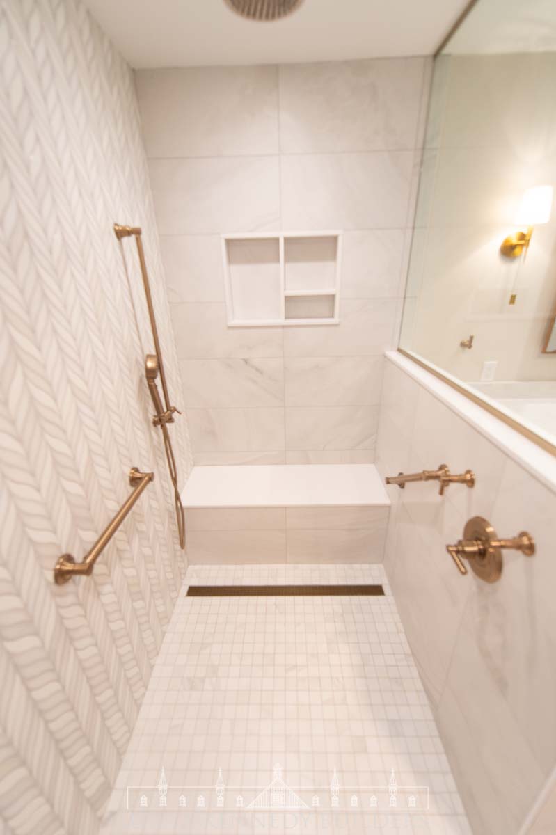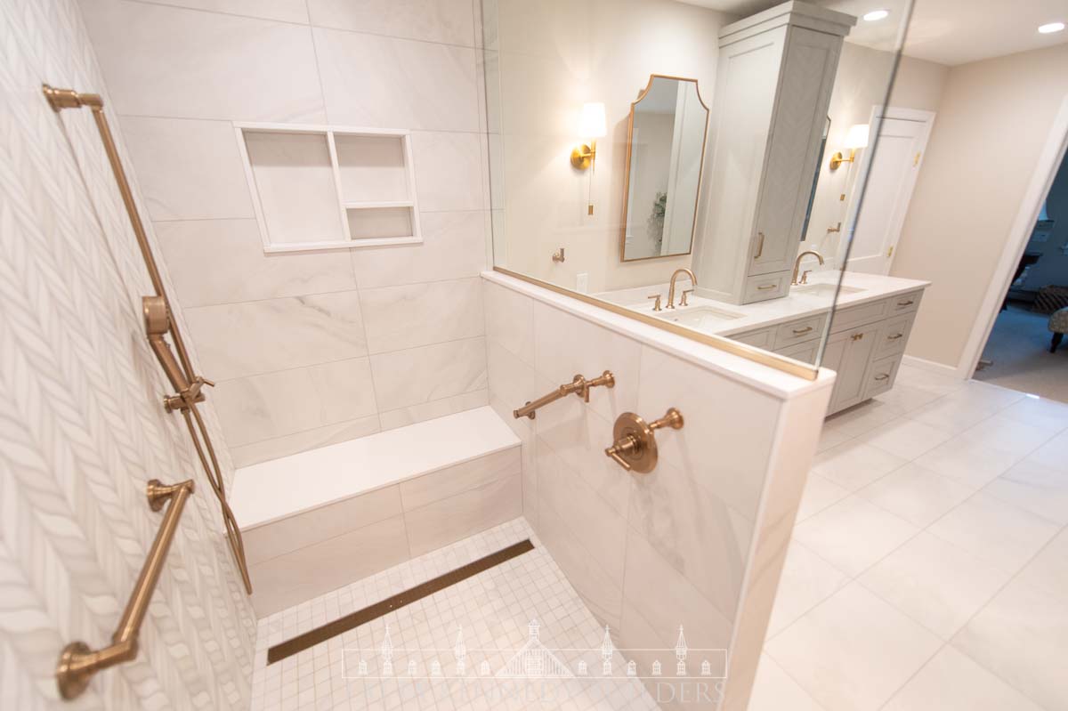 This Merion Station, PA bathroom remodel was designed to deliver a true spa-like experience with every detail thoughtfully curated for comfort and elegance. The transformation began by removing the existing tub to create a spacious, curb-less walk-in shower featuring a rain head, shower handheld, grab bars, and a built-in bench for ultimate relaxation and accessibility. The shower walls showcase a stunning accent tile, “Baroque Floret Blanco & White Jade”, adding texture and visual interest to the serene palette.