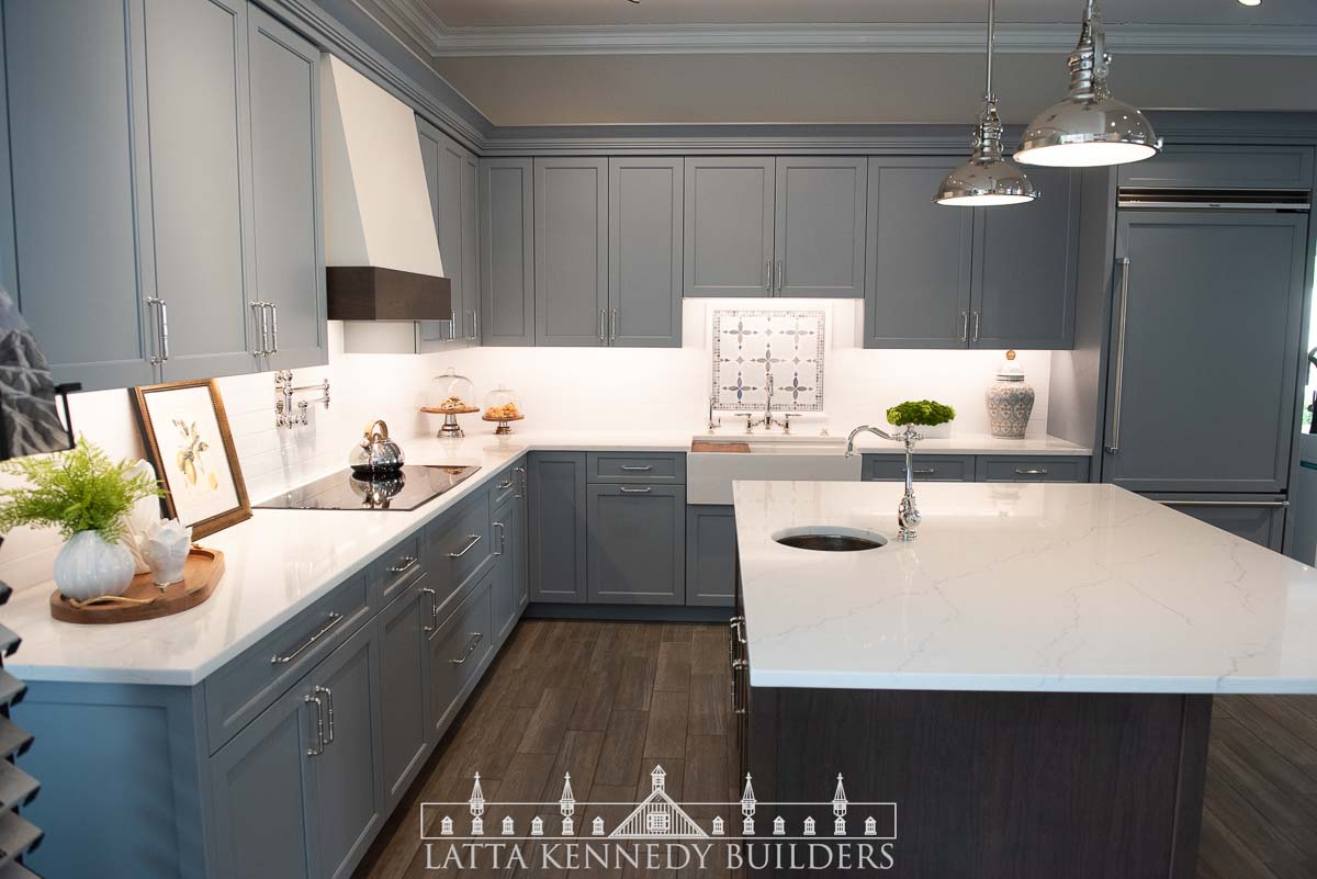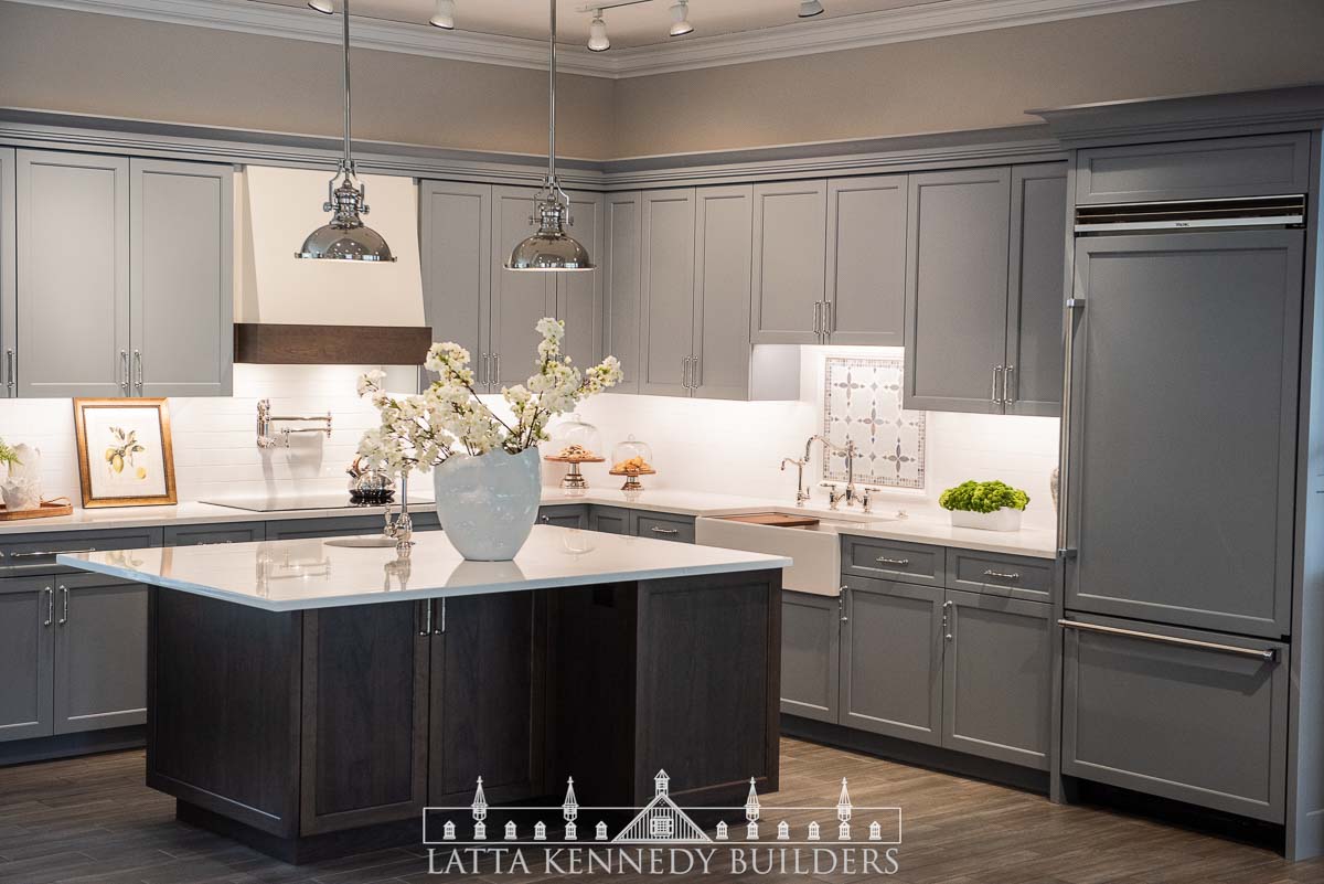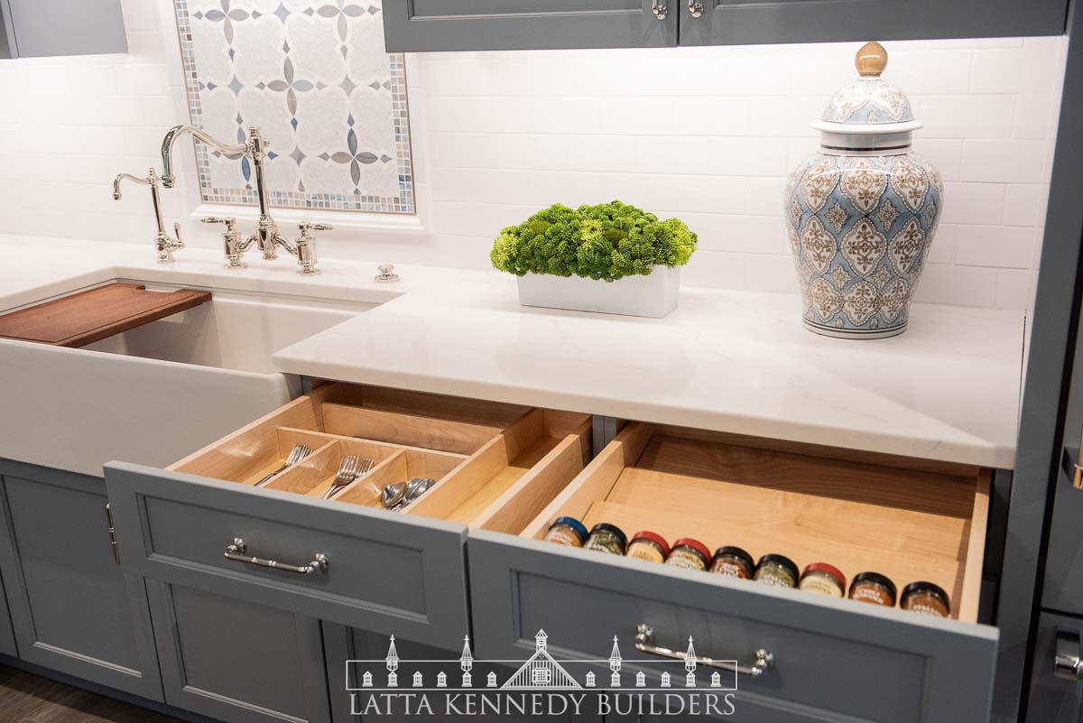 We paired with our sister company Latta Kennedy Millworks to design, build, and install all new custom cabinetry for a kitchen showroom in Wayne, Pennsylvania. This custom frameless cabinetry boasts distinctive detailing and finishing from our millworks team including refrigerator paneling, custom base cabinetry specifically made to accommodate a new farmhouse sink, cabinet inserts for enhanced organization, and deluxe walnut accents incorporated at both the island and custom-built range hood. Specific storage accessories include adjustable dividers, pull-out spice trays, and various drawer rollouts for essential cookware storage solutions. Stop by the Exquisite Design showroom to see why Latta Kennedy Millworks’ craftsmanship is superior to the rest!