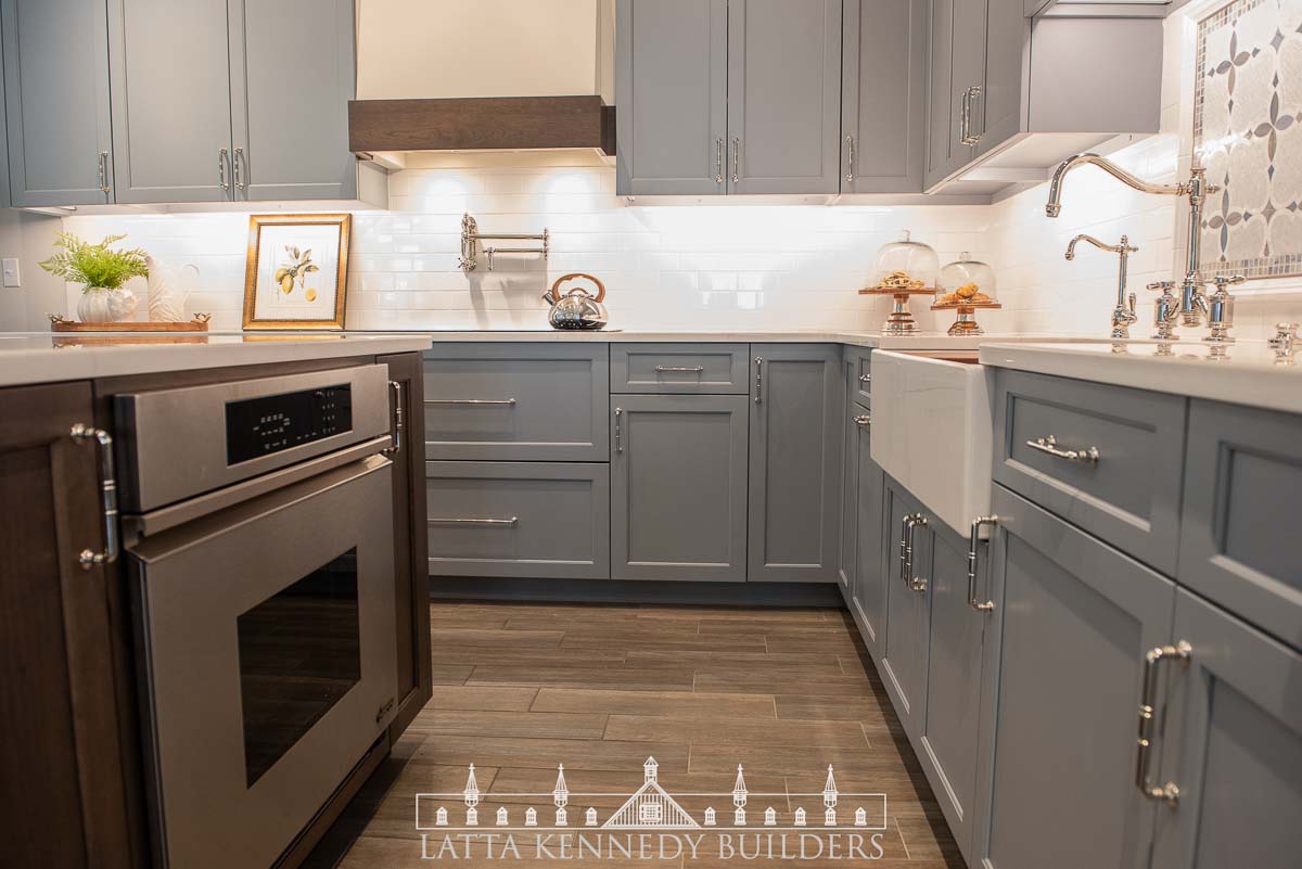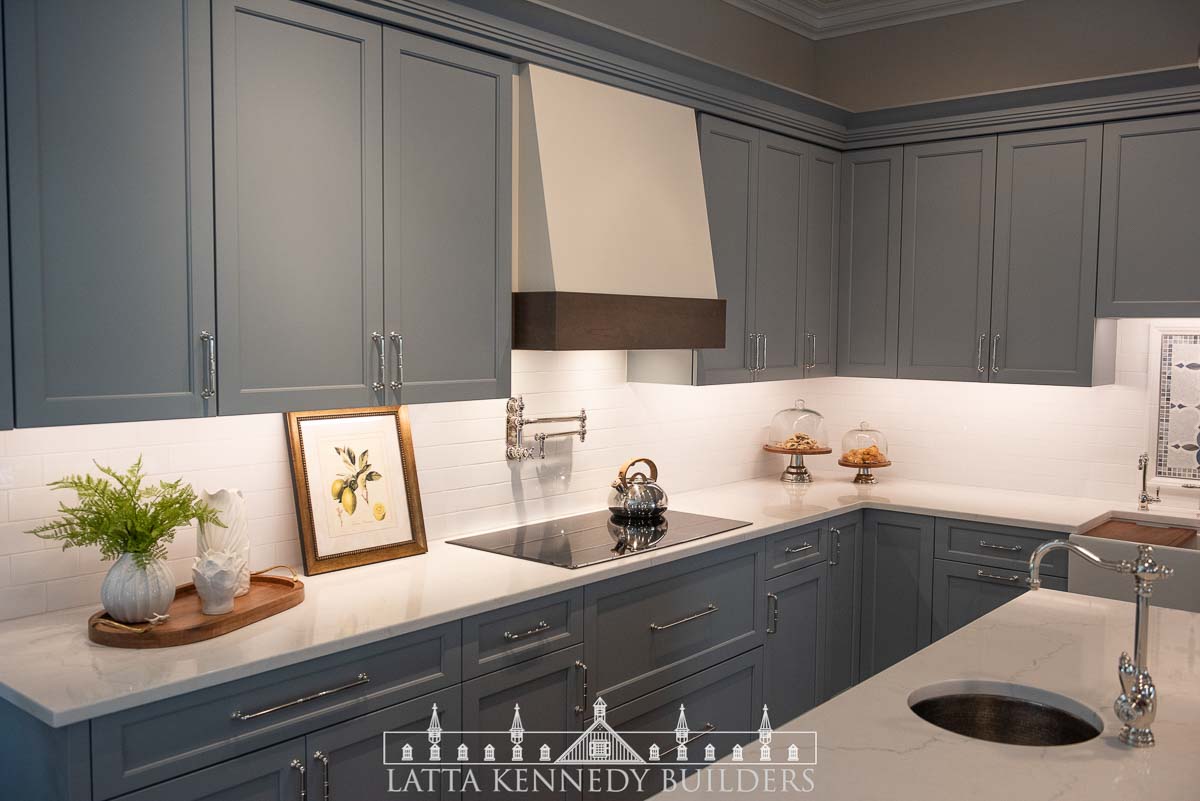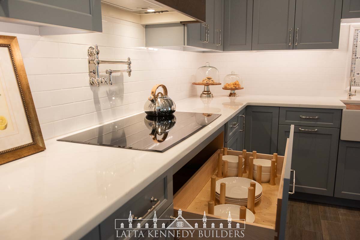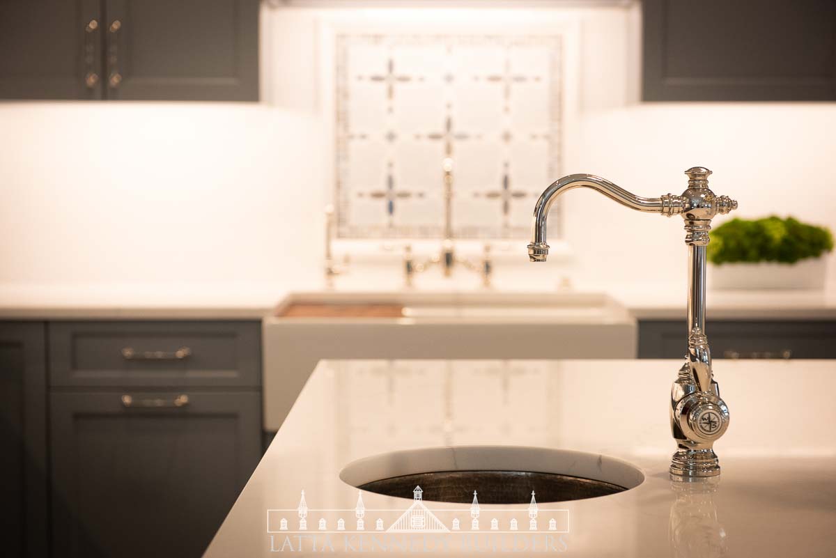 We paired with our sister company Latta Kennedy Millworks to design, build, and install all new custom cabinetry for a kitchen showroom in Wayne, Pennsylvania. This custom frameless cabinetry boasts distinctive detailing and finishing from our millworks team including refrigerator paneling, custom base cabinetry specifically made to accommodate a new farmhouse sink, cabinet inserts for enhanced organization, and deluxe walnut accents incorporated at both the island and custom-built range hood. Specific storage accessories include adjustable dividers, pull-out spice trays, and various drawer rollouts for essential cookware storage solutions. Stop by the Exquisite Design showroom to see why Latta Kennedy Millworks’ craftsmanship is superior to the rest!